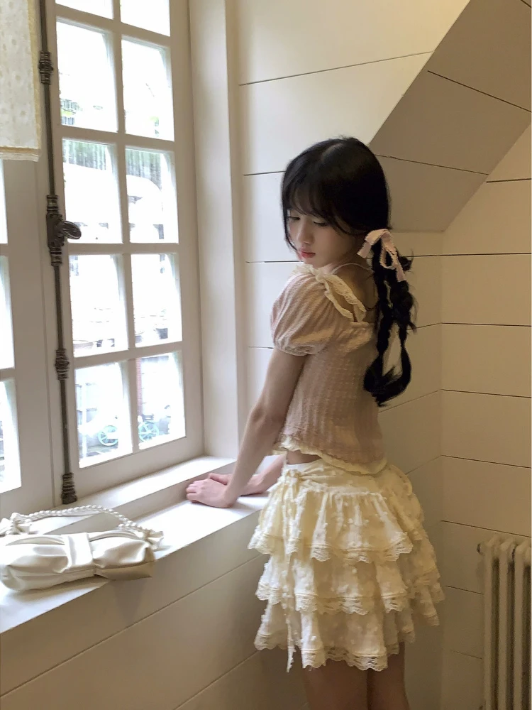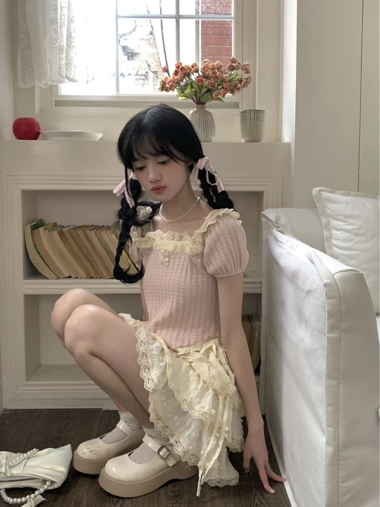 Mini Skirts Women Sweet Kawaii Lace Ruffles Patchwork Y2k Beige Japanese Lolita Streetwear All-match Party Students Summer Chic