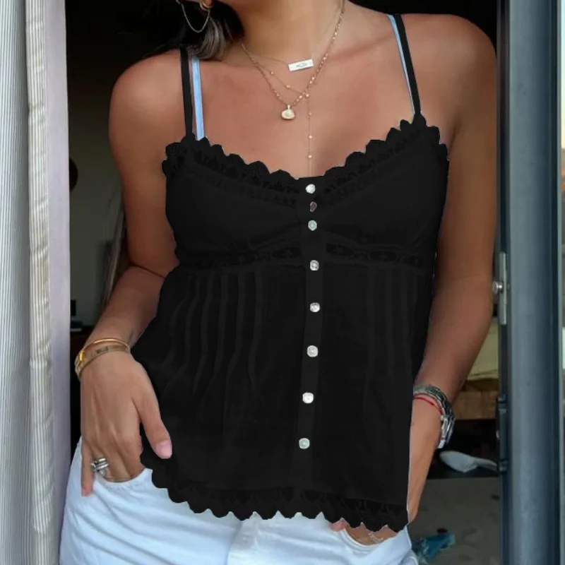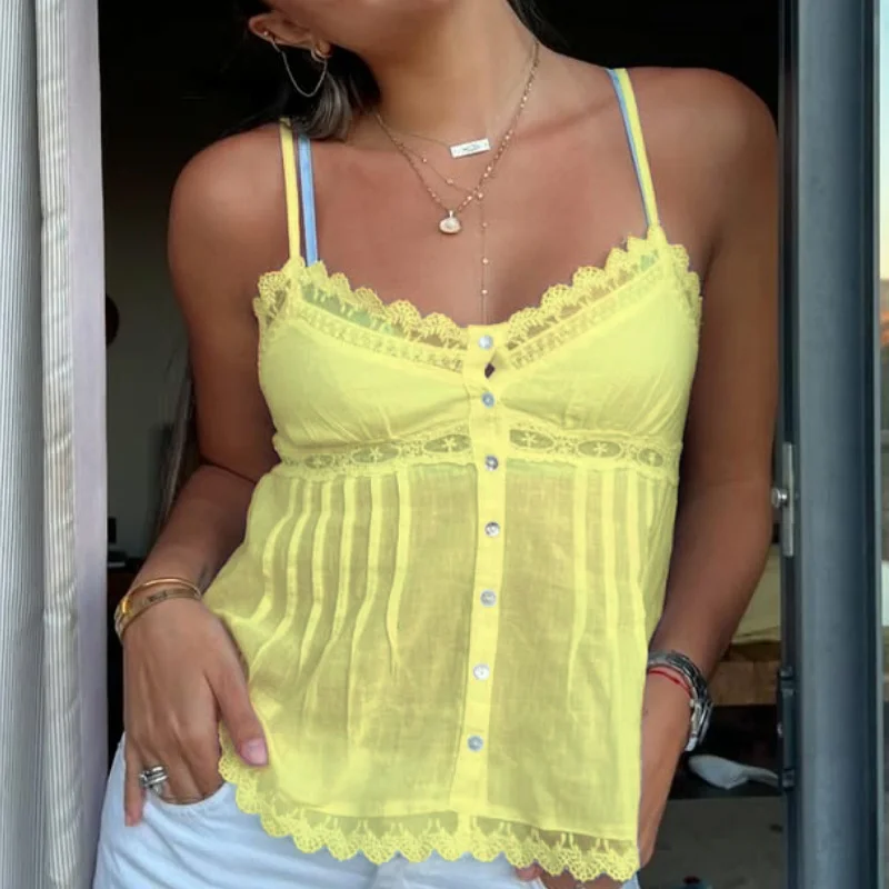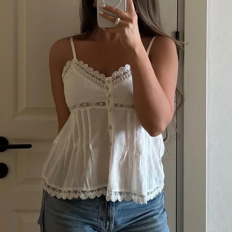 Sweet Y2K Lace Trim Camisole Women's Spaghetti Strap Top Trendy Button up Solid Babydoll Crop Tops Summer Fairycore Milkmaid Top